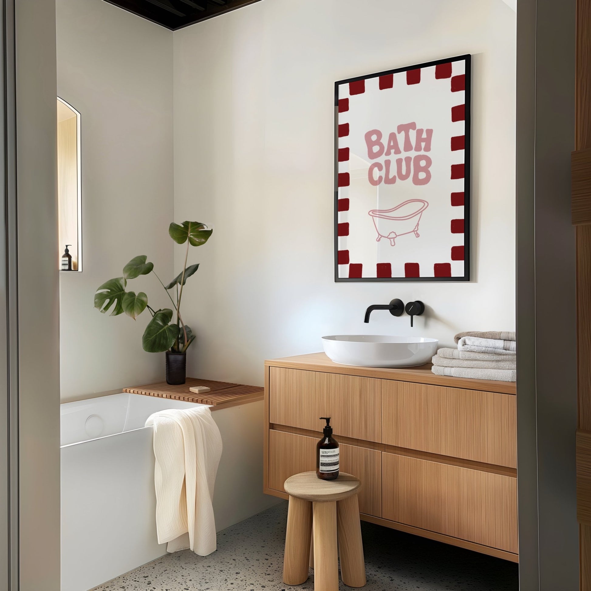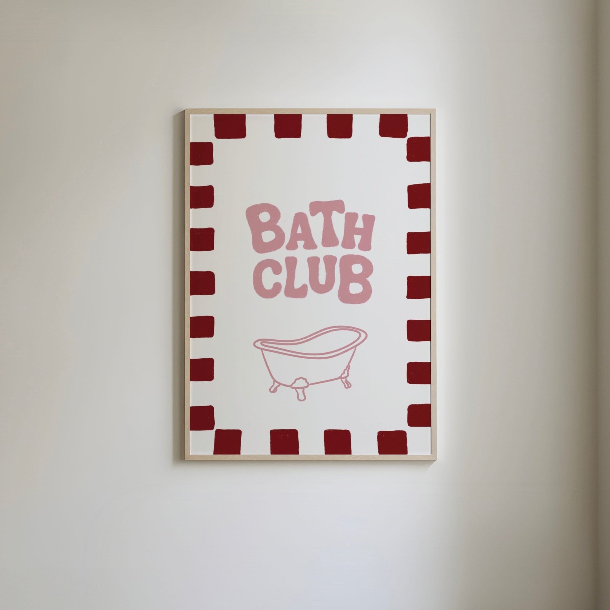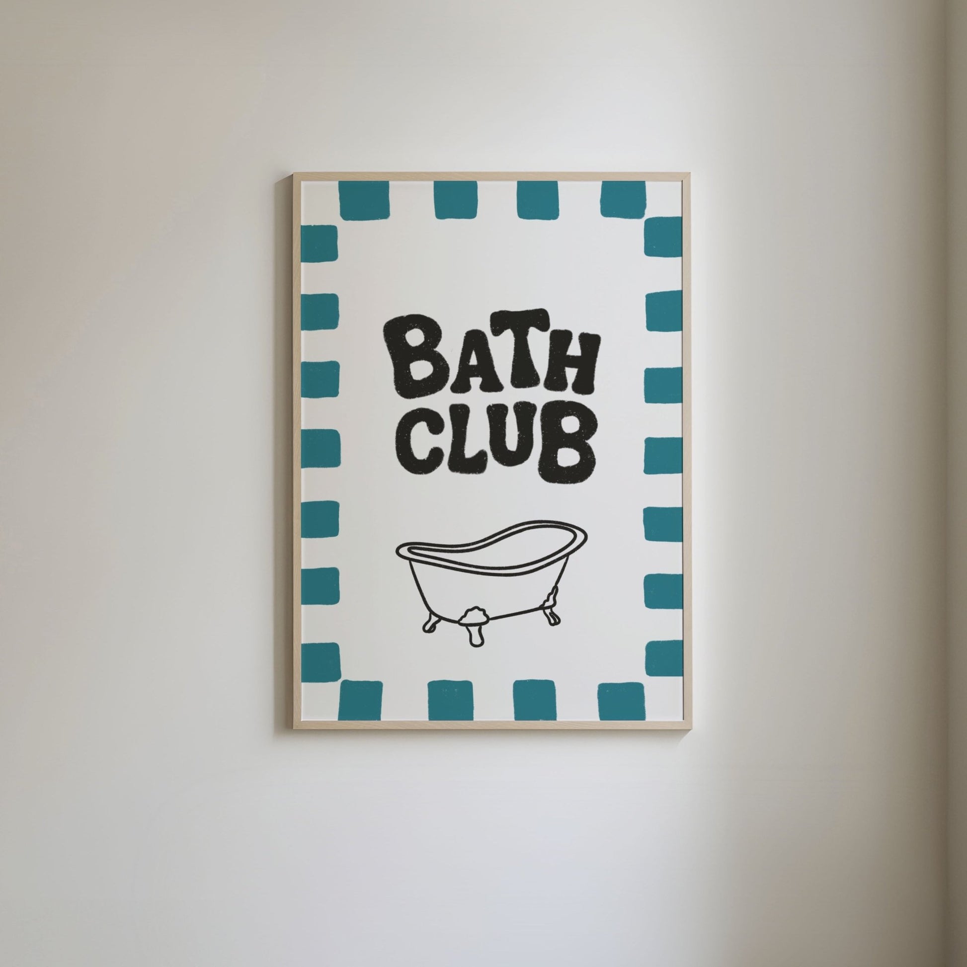 Relax and unwind in style with our playful 'Bath Club' print. Featuring a bold bath illustration and vibrant typography, this design adds a fresh touch to any bathroom or spa-inspired space. Available in three colourways—blue and black, green and pink, or red and pink—tThis print adds a burst of color and joy to your space.