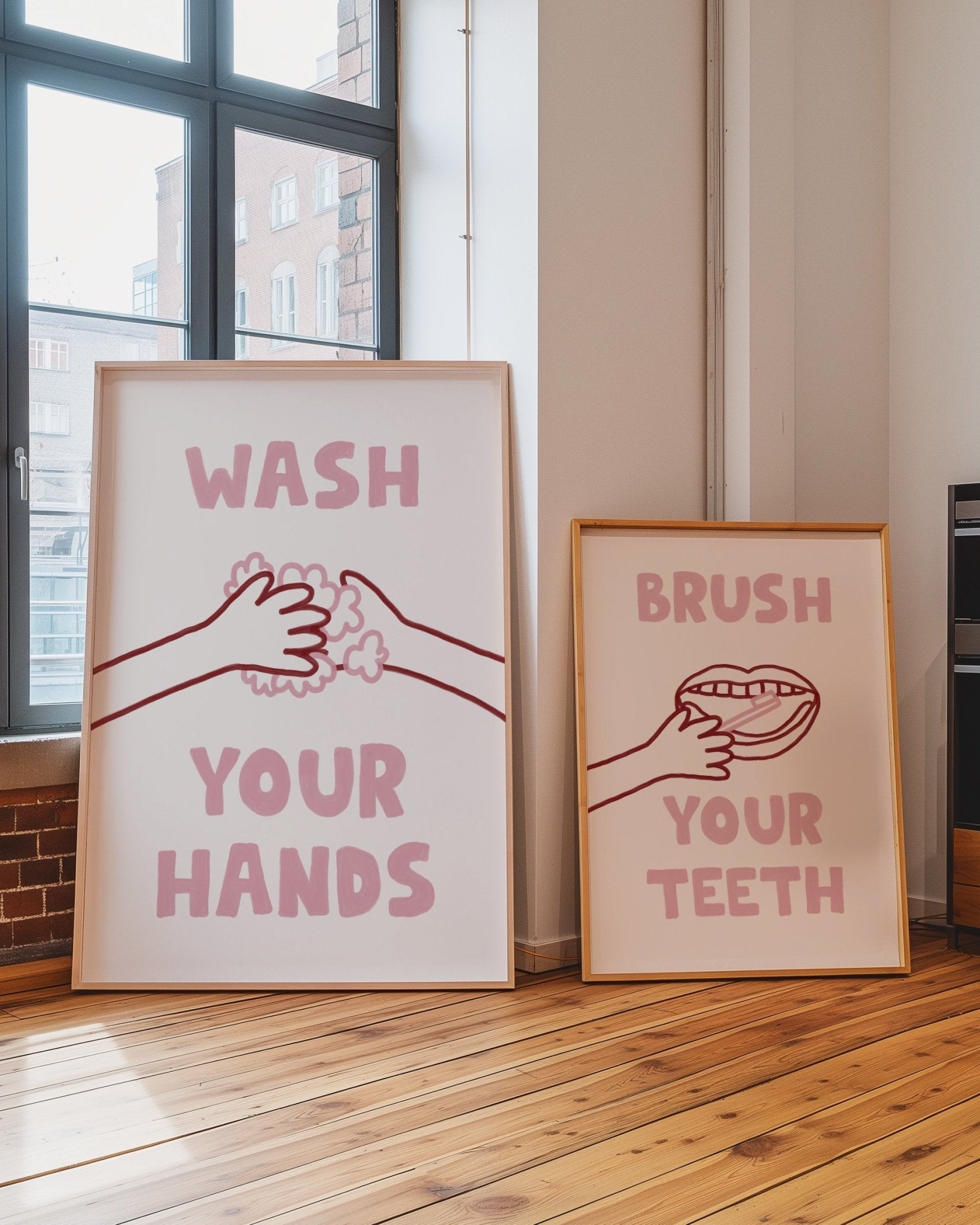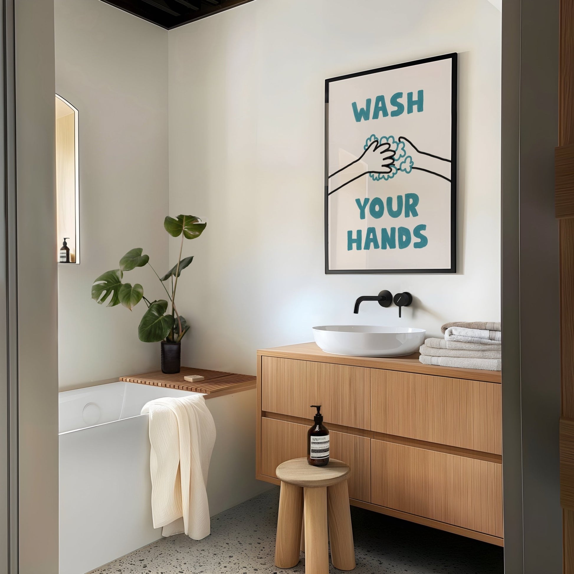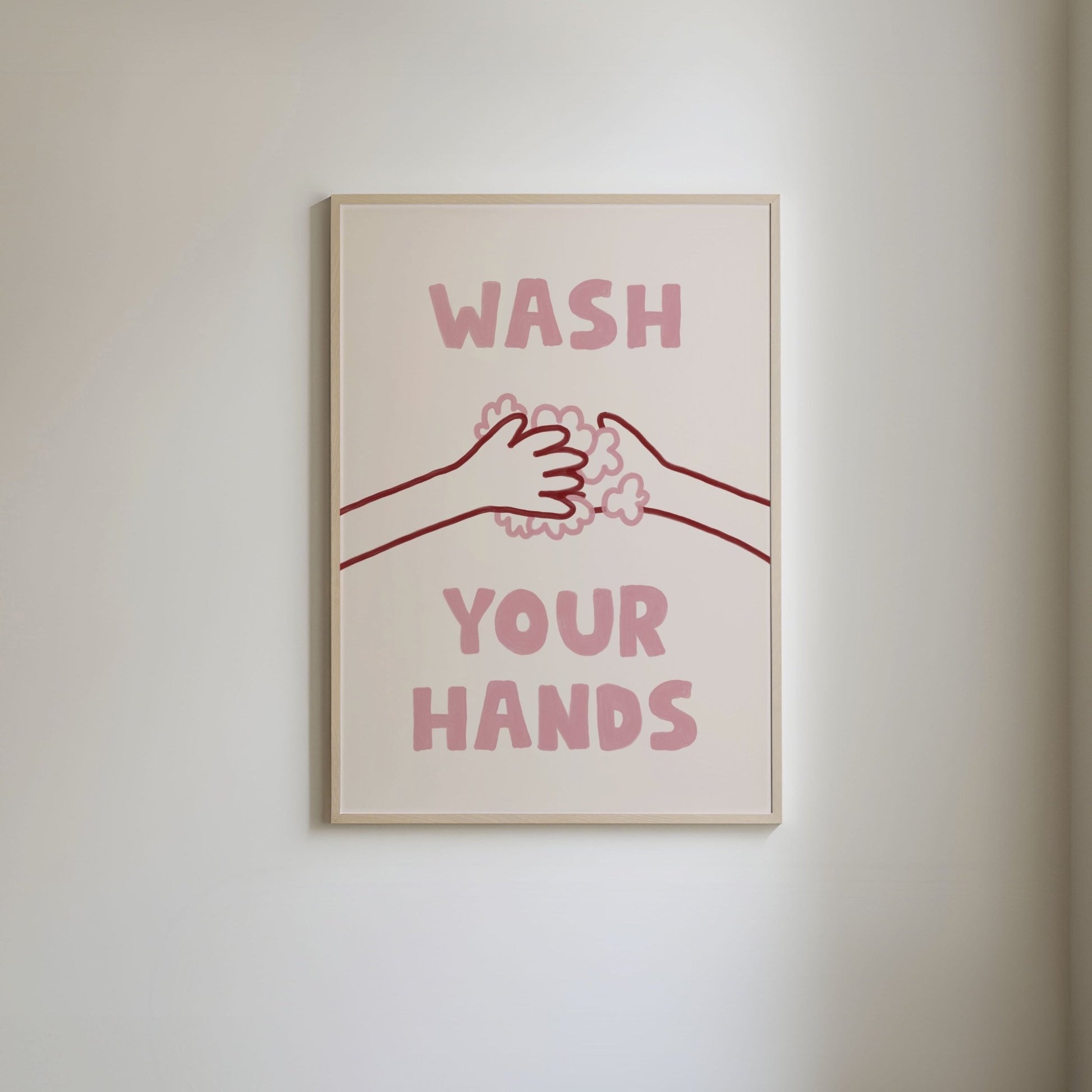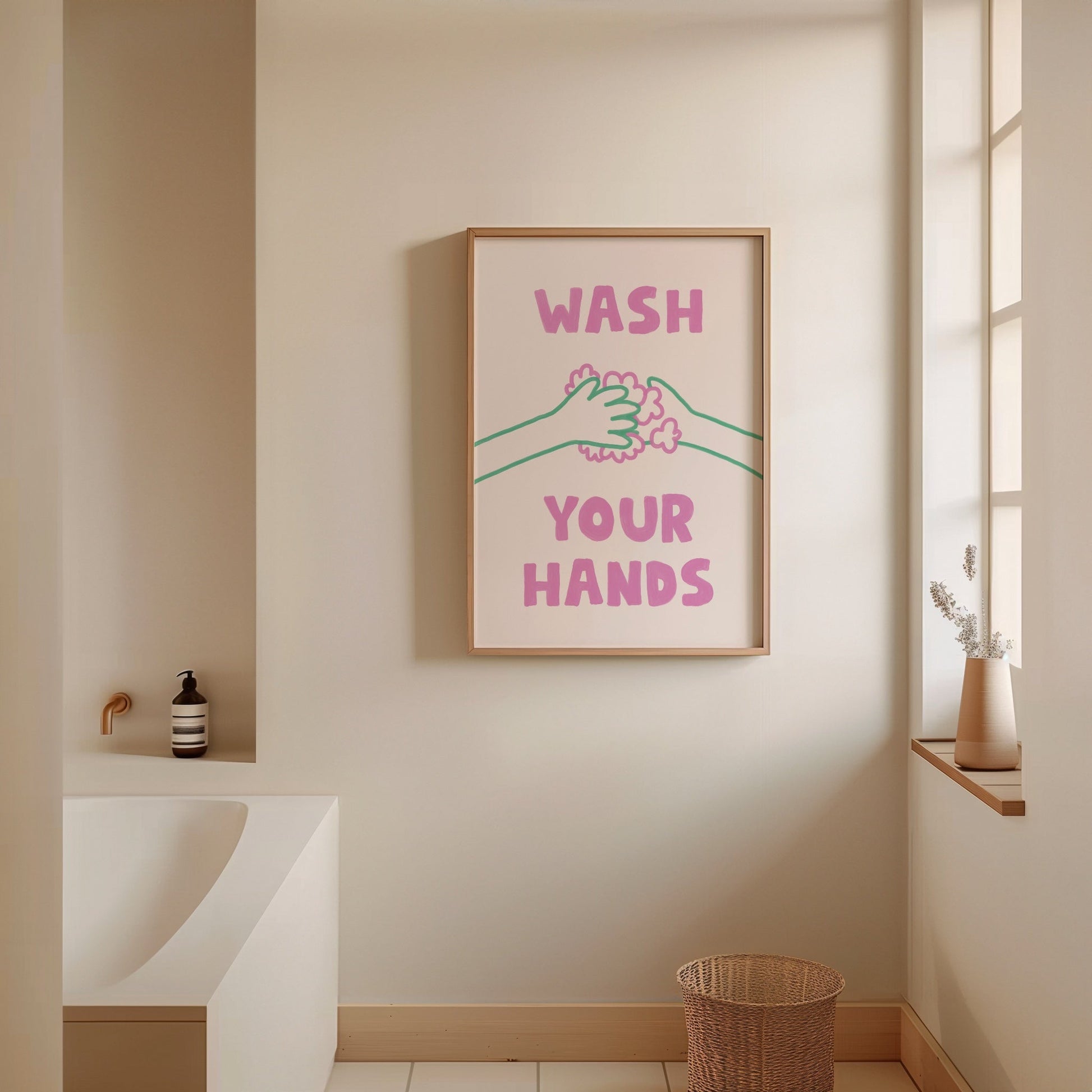Brighten up your bathroom with this fun "Wash Your Hands" print, available in bold colour combinations like green and pink, red and pink, or blue and black. The playful design adds a pop of colour to both kids’ and adult bathrooms. With its modern painted style, this print encourages good hygiene in a lighthearted way while adding a touch of fun to your decor. Perfect for making your bathroom a little more vibrant and reminding everyone to wash their hands with style.