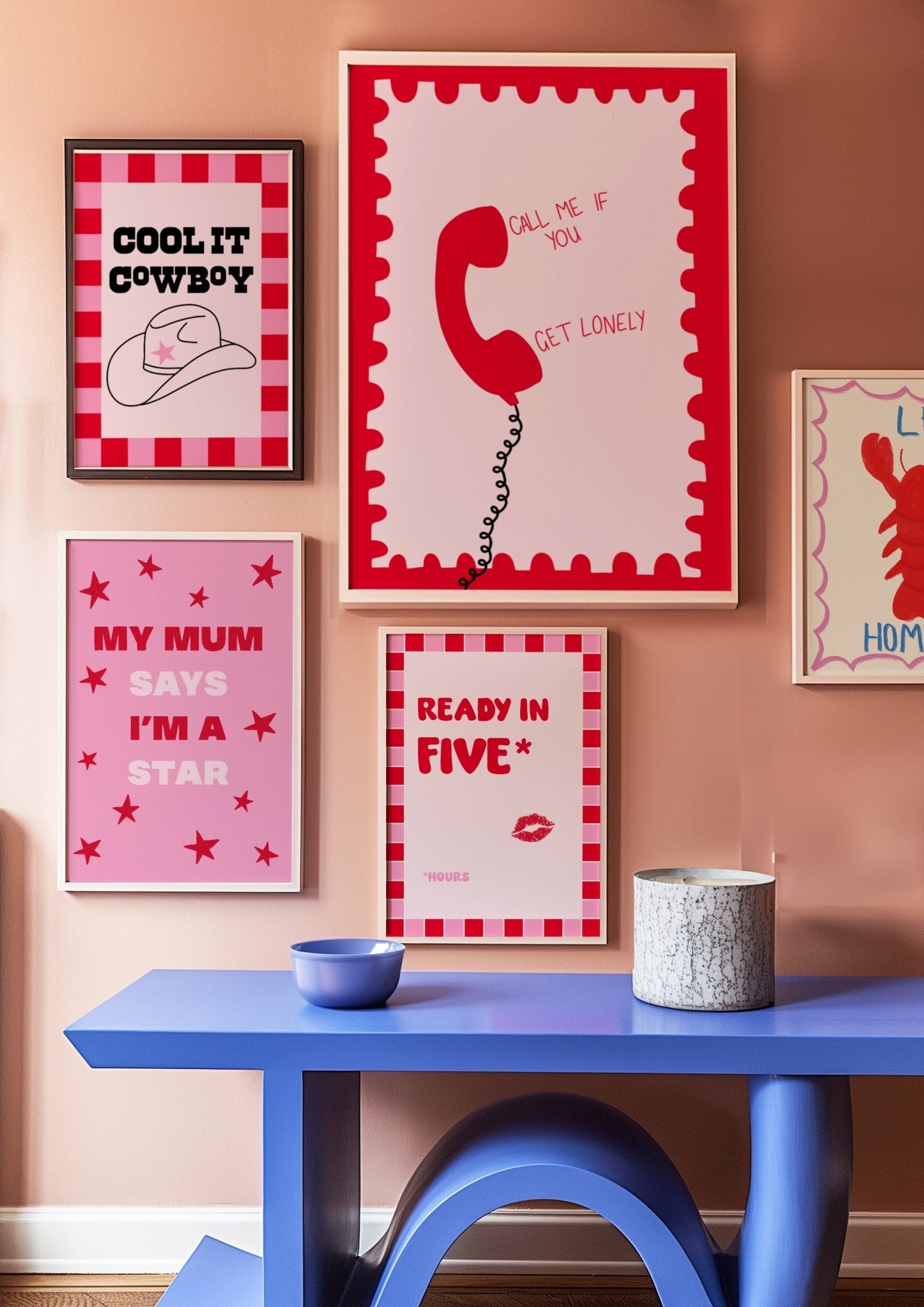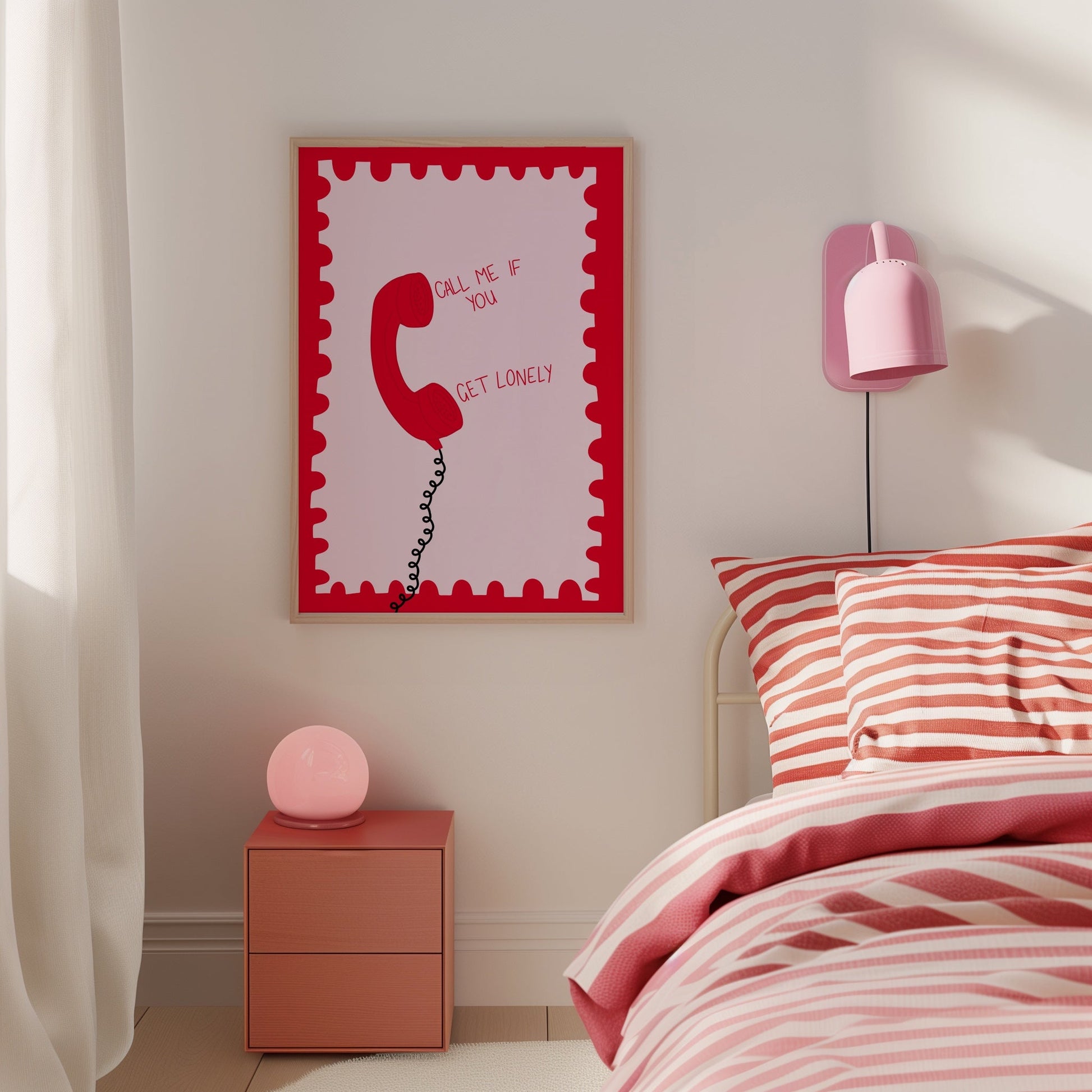 Get ready to add a touch of retro charm to your space with this quirky "Call Me If You Get Lonely" pink and red print. Featuring a fun telephone illustration, this girly print is perfect for your bedroom or dressing room. Don't wait, give your walls a playful upgrade today!