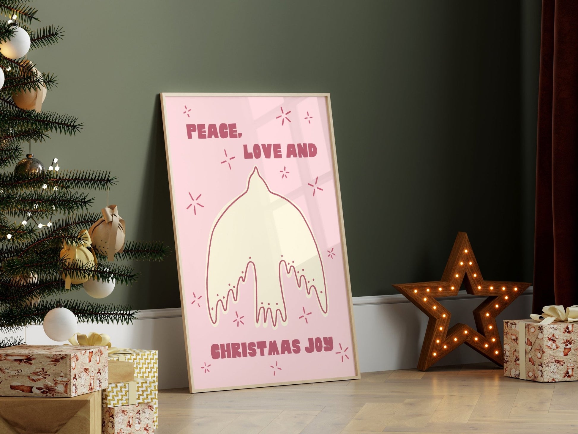 Spread festive cheer with our Peace, Love and Christmas Joy wall art print. Set against a playful pink backdrop with a hand-drawn Christmas dove, this artwork radiates warmth, positivity and holiday spirit. Perfect for brightening up living rooms, bedrooms or cosy corners, it adds a colourful and uplifting touch to your seasonal decor. A joyful piece of Christmas wall art, it is a cute reminder of the magic and meaning of the festive season.
