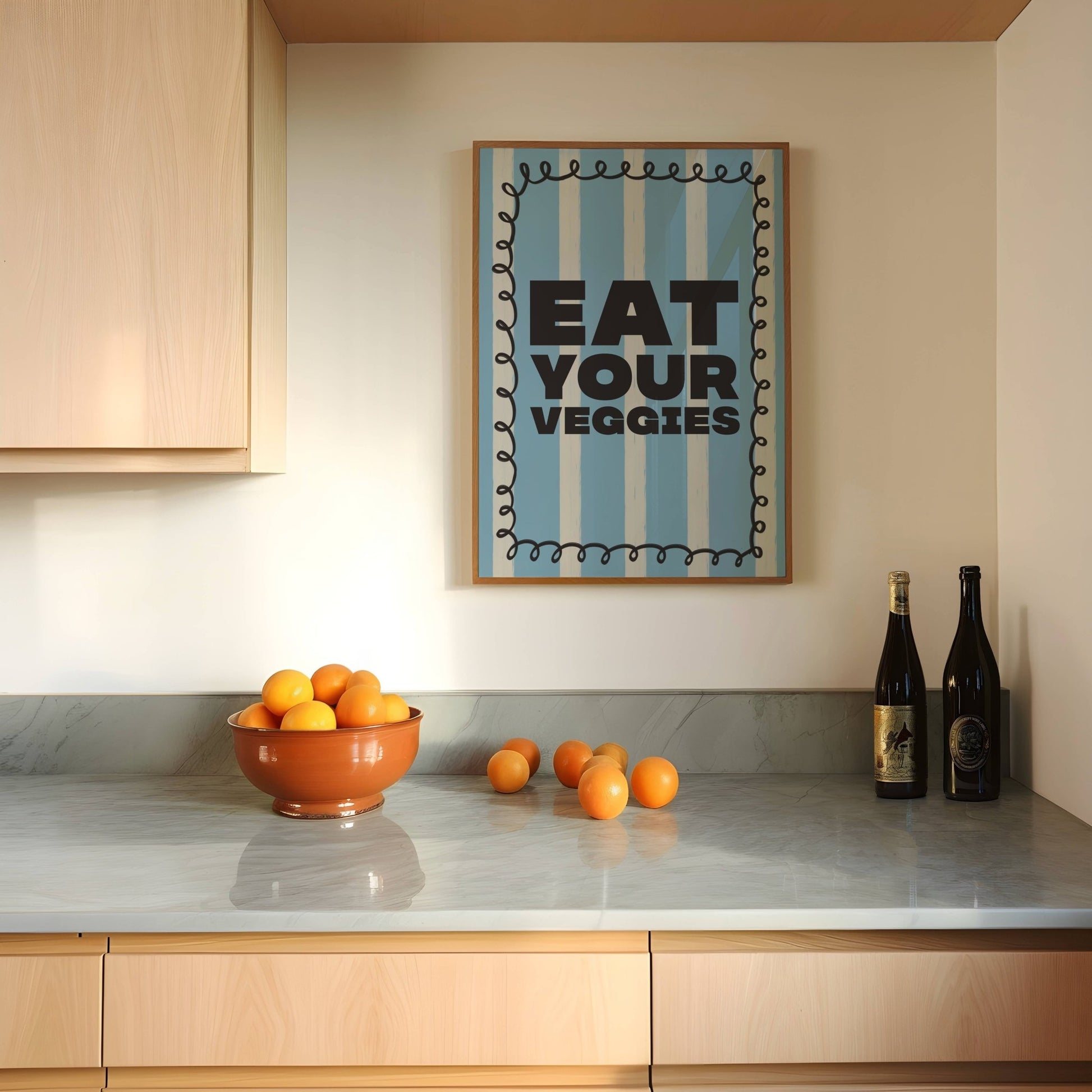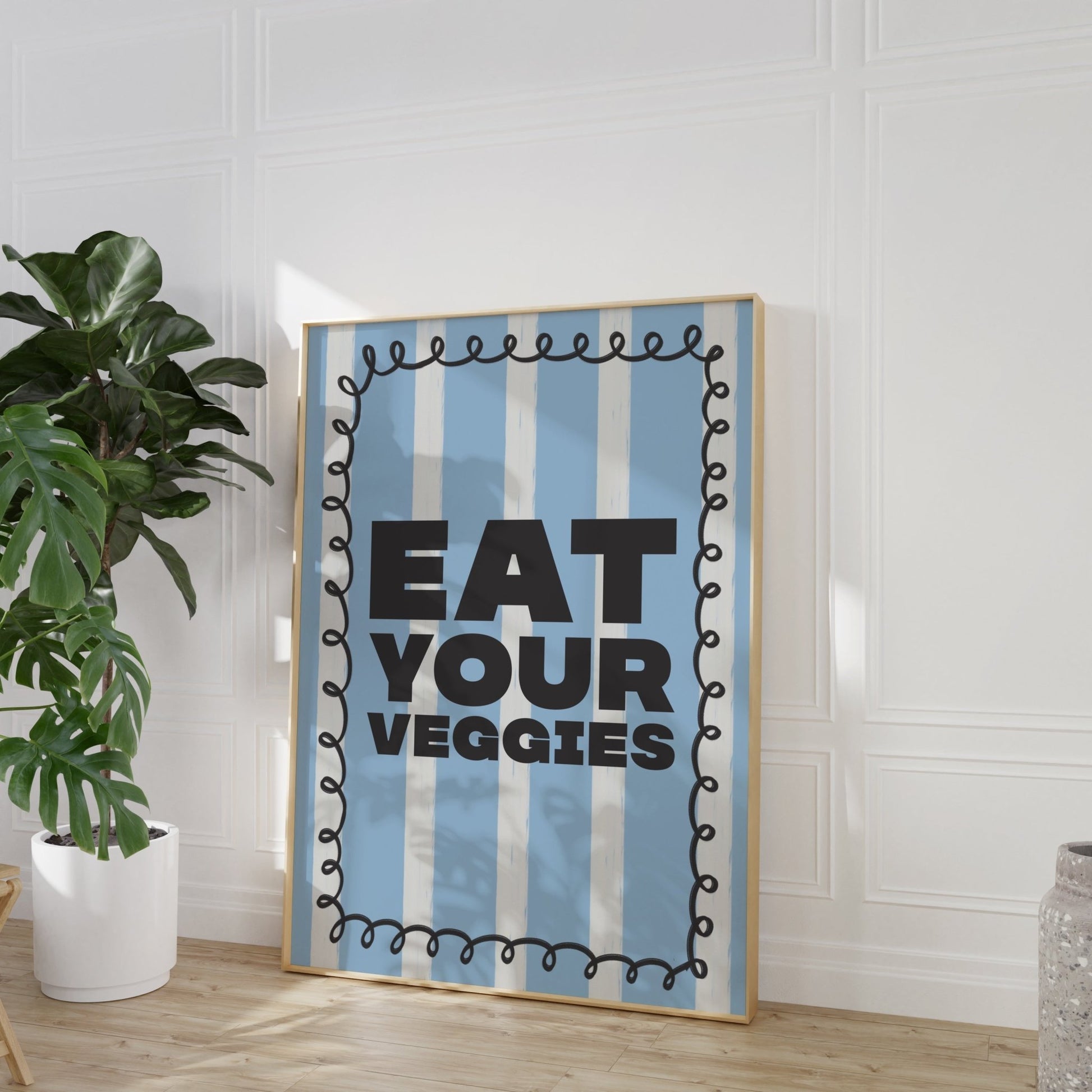 Get your daily dose of humour and healthy reminders with our Eat Your Veggies Print! This fun and playful kitchen wall art features a unique hand-drawn elements and modern typography. Perfect for foodies and anyone looking to add some personality to their kitchen. Don't miss out on this beautiful kitchen art!