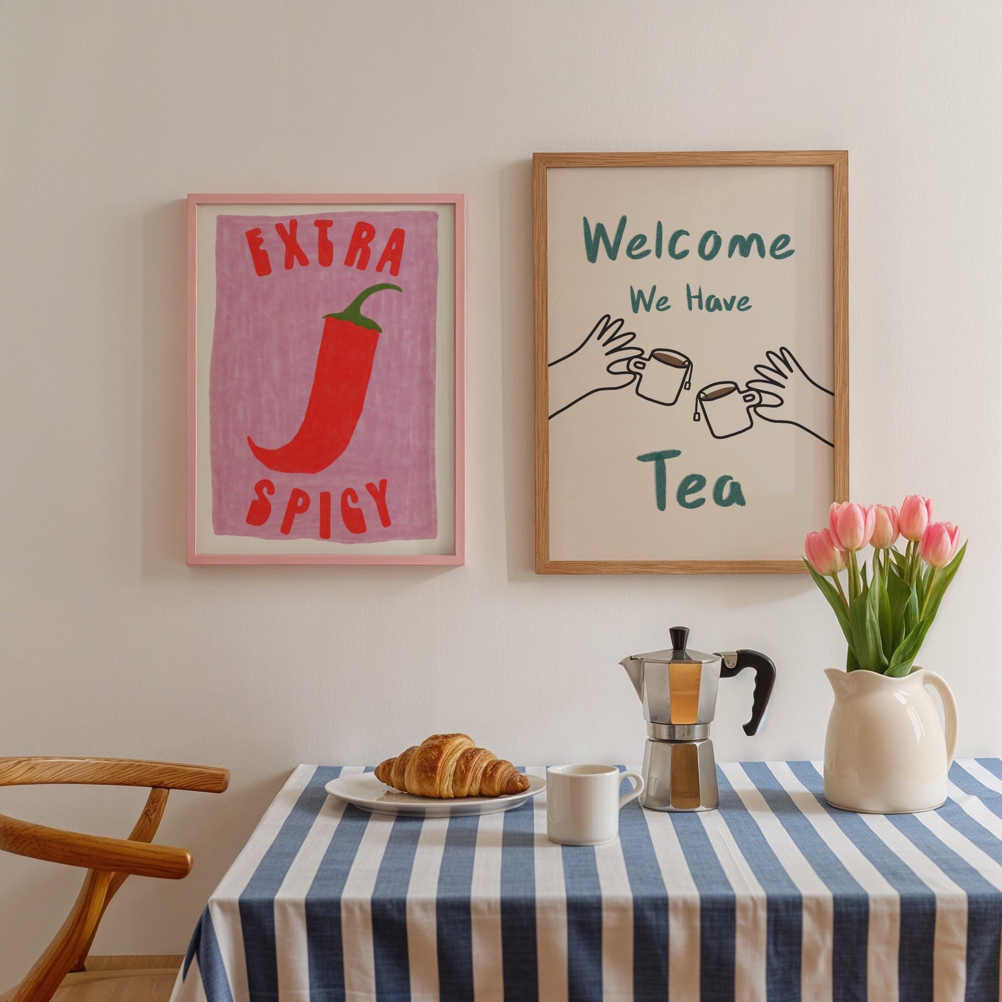 Add some heat to your kitchen or dining room with this 'Extra Spicy' chili pepper print, featuring vibrant pink tones and a hand-drawn food illustration. A bold and colourful piece of wall art with striking typography that brings personality and fun to your home!