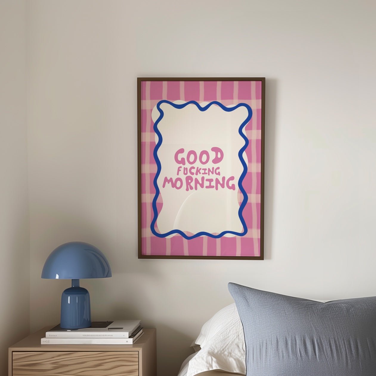 Start your day with our "Good Fucking Morning" print! This cheeky poster in blue and pink is perfect for adding a playful touch to your bedroom decor. With its fun and colourful aesthetic, it's sure to make you smile every morning, even for the most grumpy of morning risers.