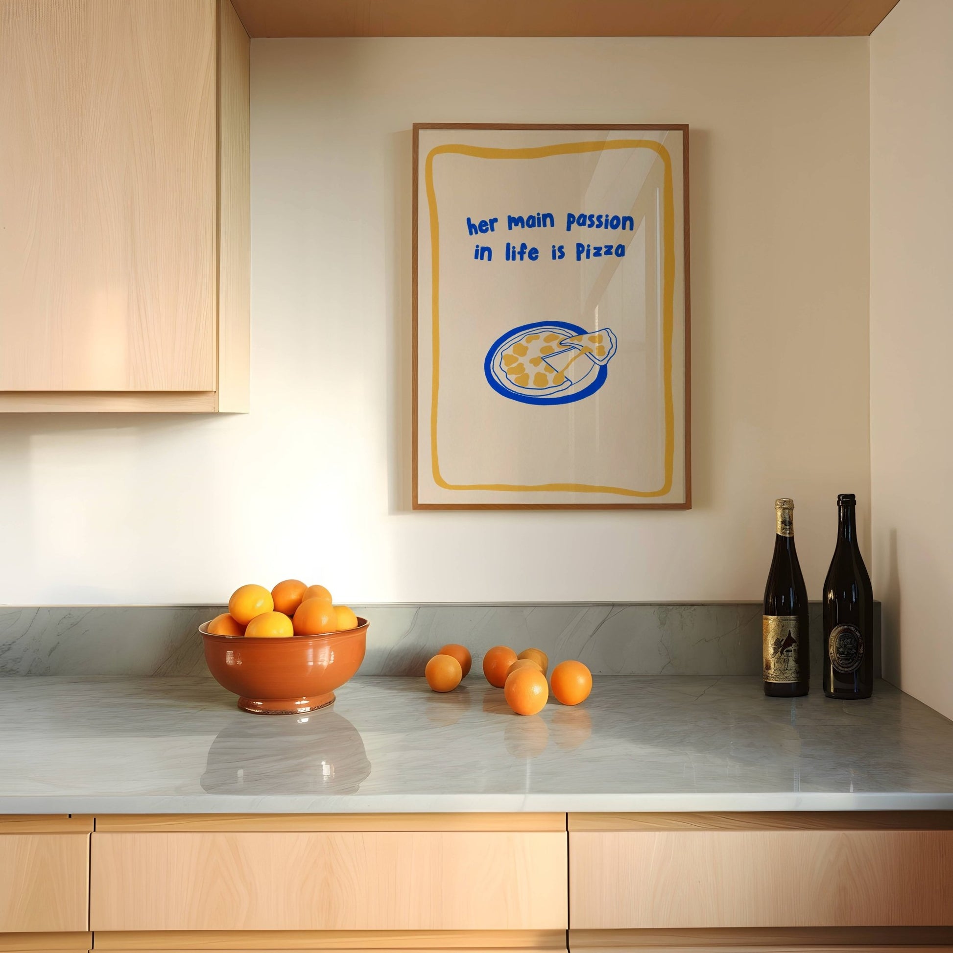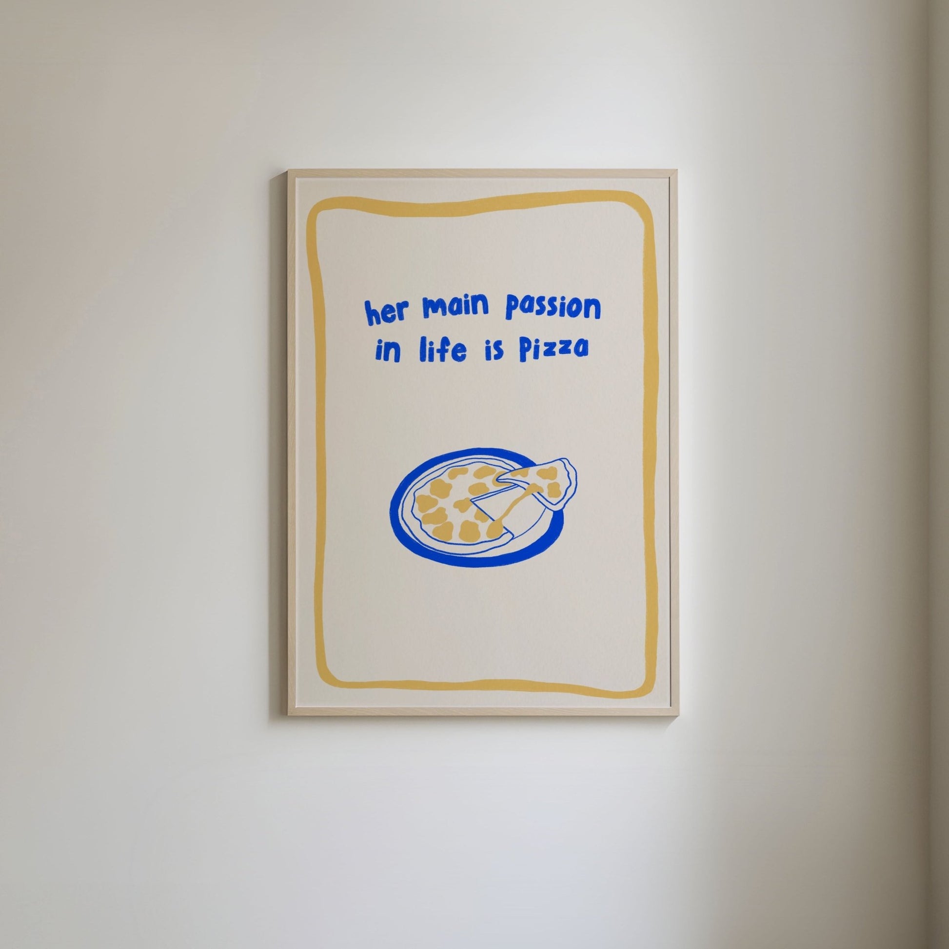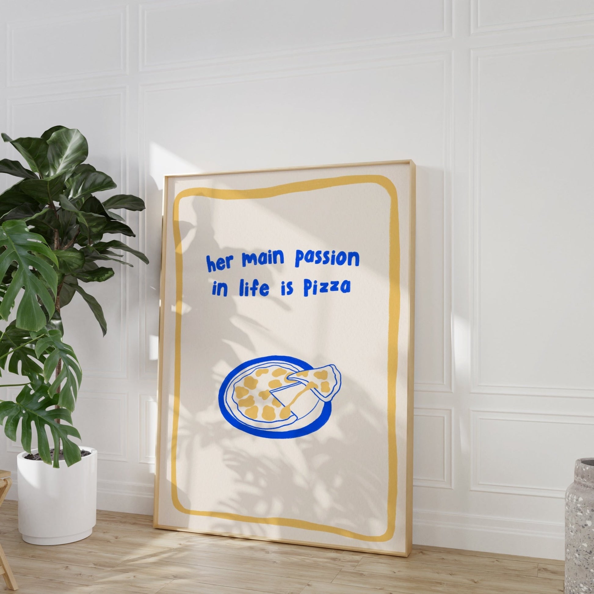 For pizza lovers who wear their passion proudly. This minimalist blue and yellow pizza illustration with the text ‘Her main passion in life is pizza’ is the perfect addition to your kitchen wall art, modern home decor, or as a fun dining room print. Ideal for those who love quirky, relatable wall art that celebrates their favourite food.