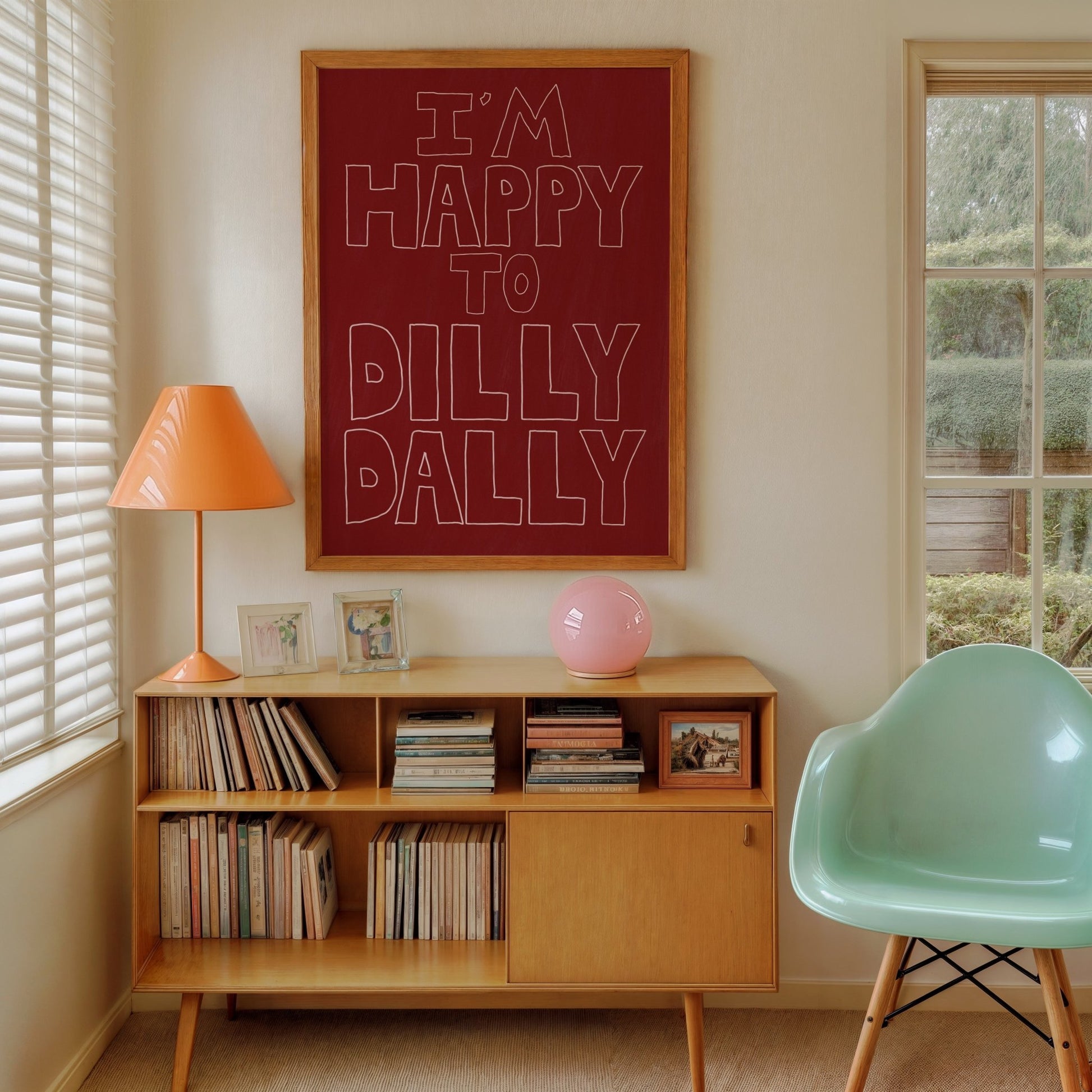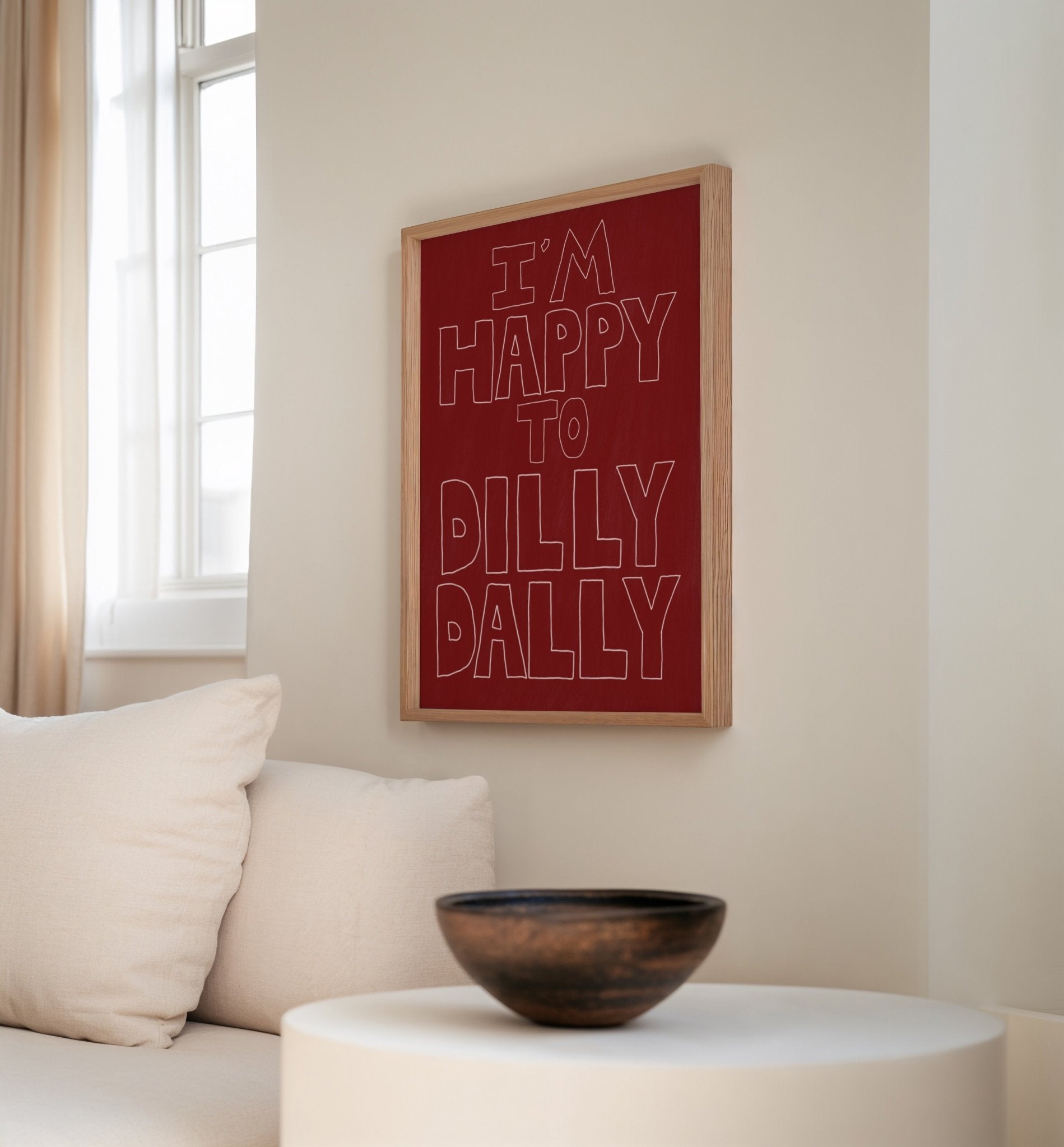 Take a break and embrace the art of doing nothing with this fun 'I'm happy to dilly dally' print. Set on a deep, brightish red background with casual, messy writing, it's a playful reminder to slow down and enjoy life. Perfect for adding a laid-back vibe to your bedroom, office, or creative nook.