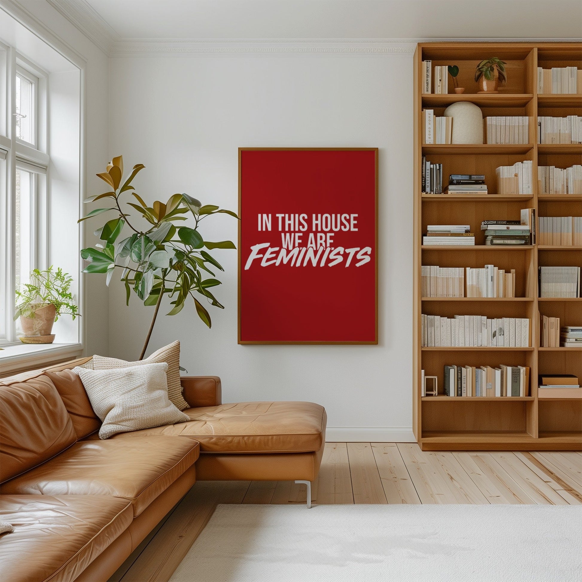 Add some empowering and playful vibes to your home with this "In This House We Are Feminist" wall art. Perfect for decorating a home office or hallway, this red print will add a bold touch to any room. Embrace your feminist beliefs and show them off proudly.