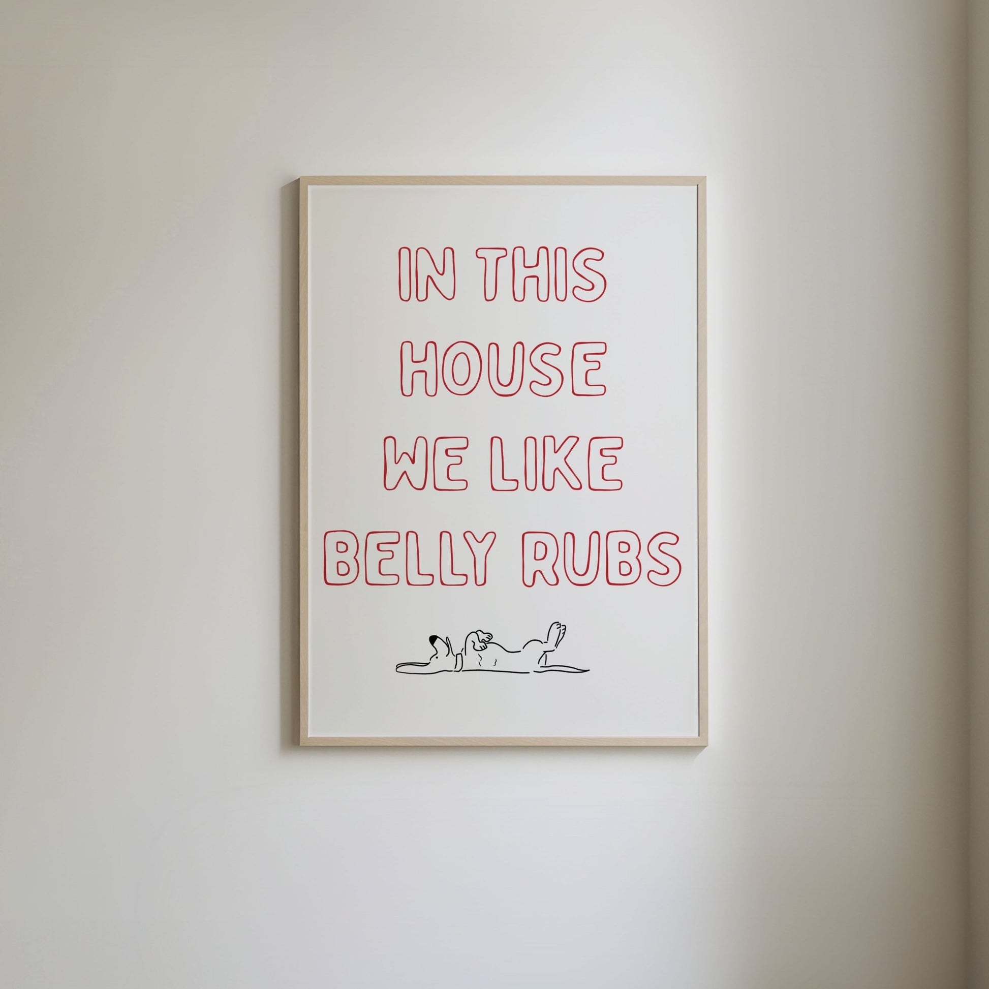 Add a dose of joy and warmth to your home with this playful "In This House We Like Belly Rubs" print. Perfect for dog lovers, this piece brings a fun and welcoming vibe to any room. Whether it's your living room, hallway or home office, it’s the ideal way to remind everyone that a little love and belly rubs go a long way (and not just with the dog 😉)!