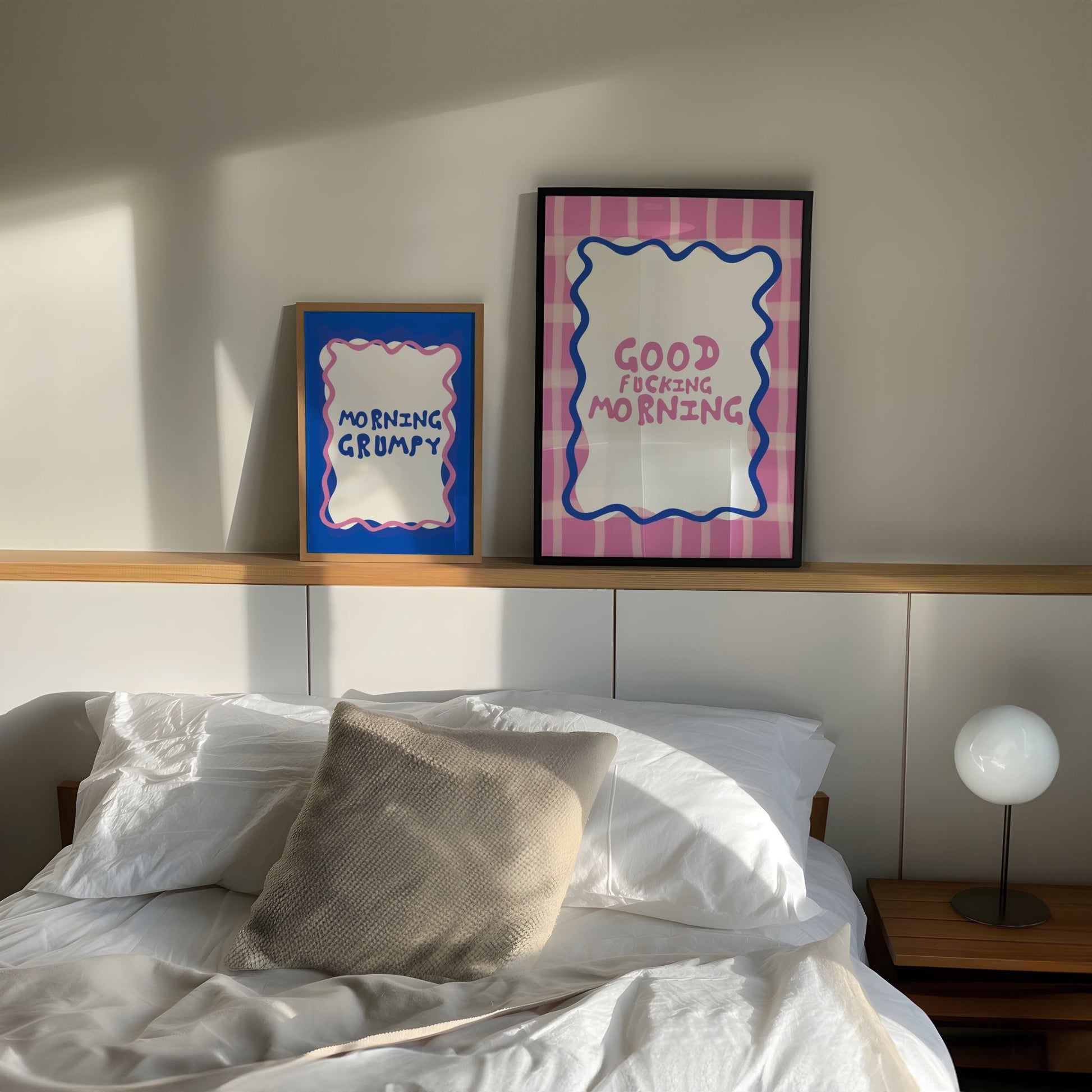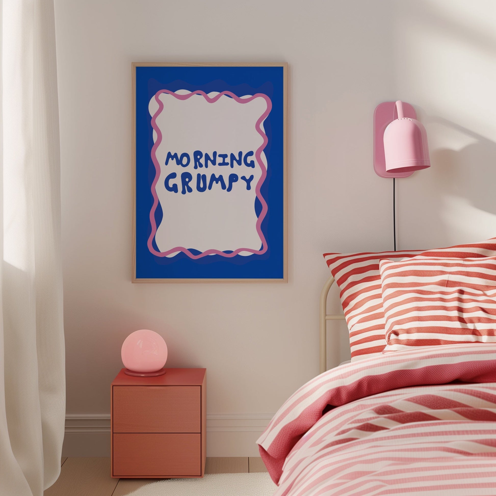 Start your day off with some laughter (and a little bit of grumpiness) with our Morning Grumpy Print! This funny bedroom wall art features quirky typography in blue and pink, making it the perfect aesthetic room decor that will liven up any space. Hang it above your bed and wake up with a little less grumpiness every morning!