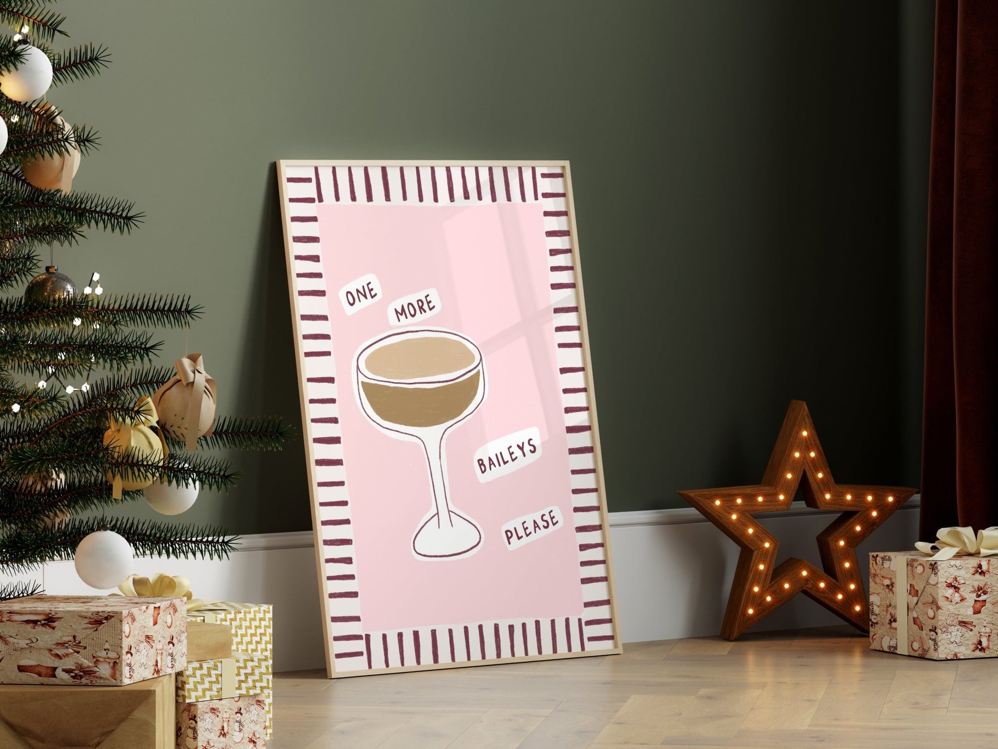 Treat yourself to a splash of festive spirit with our One More Baileys Please print. Featuring a charming hand-drawn illustration of the classic Christmas drink, this artwork brings cosy charm and playful energy to your walls. It is the perfect addition to kitchens, dining spaces or home bars, creating a warm and inviting holiday vibe. A standout piece of fun festive art, it captures the joy of those creamy Christmas indulgences we all love to savour.