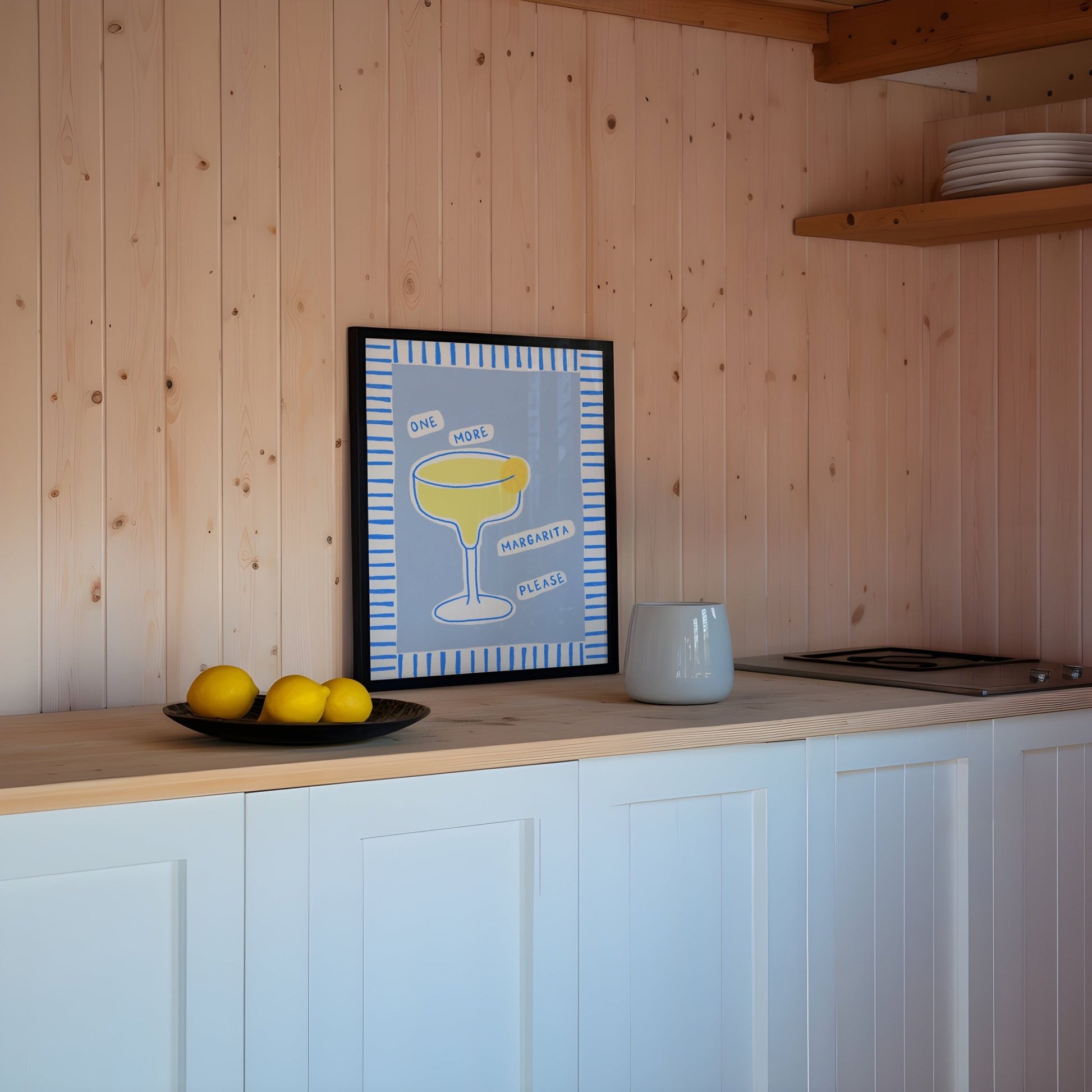 Bring a burst of colour and fun to your space with our hand-drawn Margarita print. Featuring a refreshing margarita cocktail in vibrant blue and yellow tones, this playful design also features the cheeky phrase "One More Margarita Please". Perfect for kitchens, home bars, or any space where you want to add some cocktail magic, this print will make a bold statement. Whether you're a fan of the classic cocktail or just love lively, colourful art, it's the ideal addition to brighten up your home.