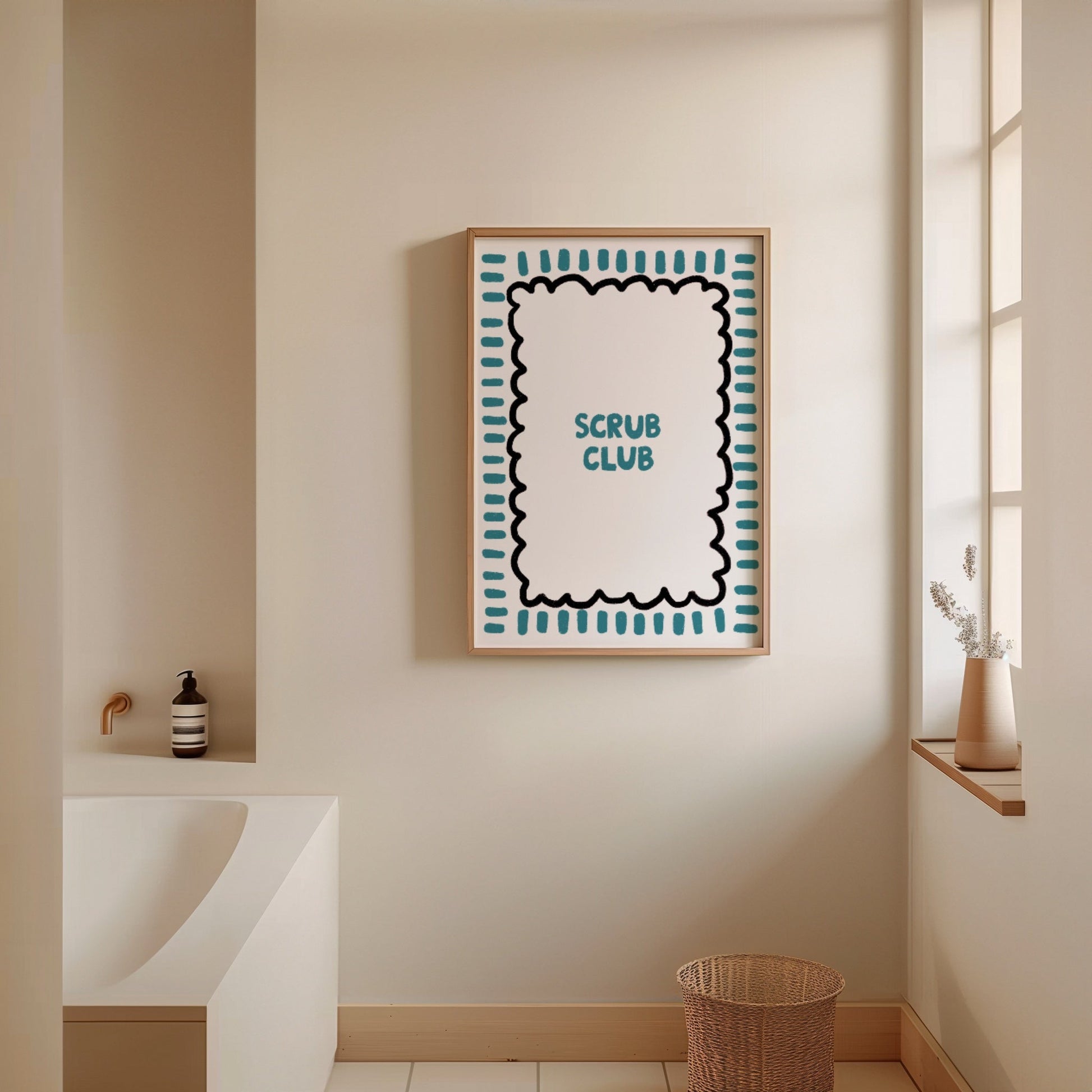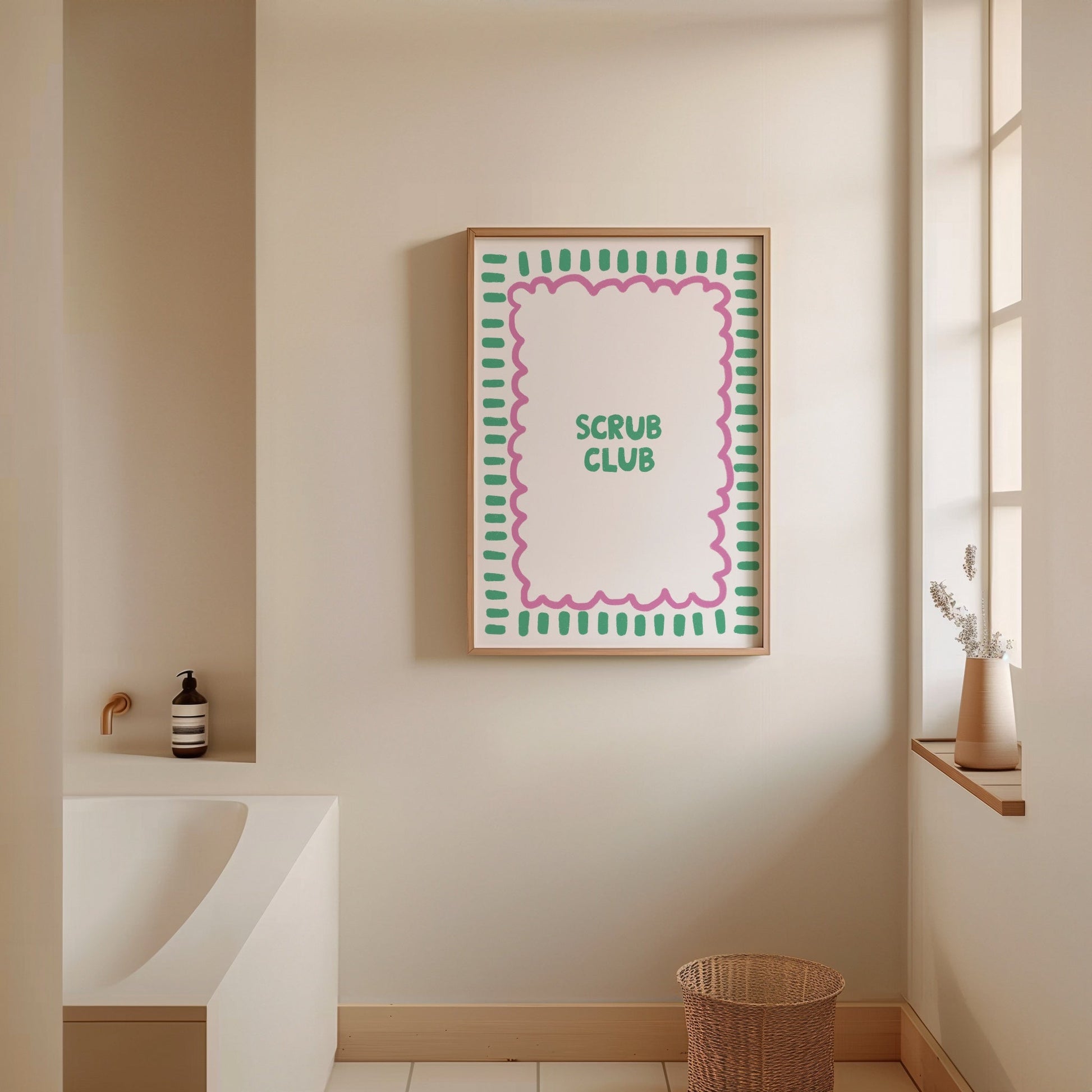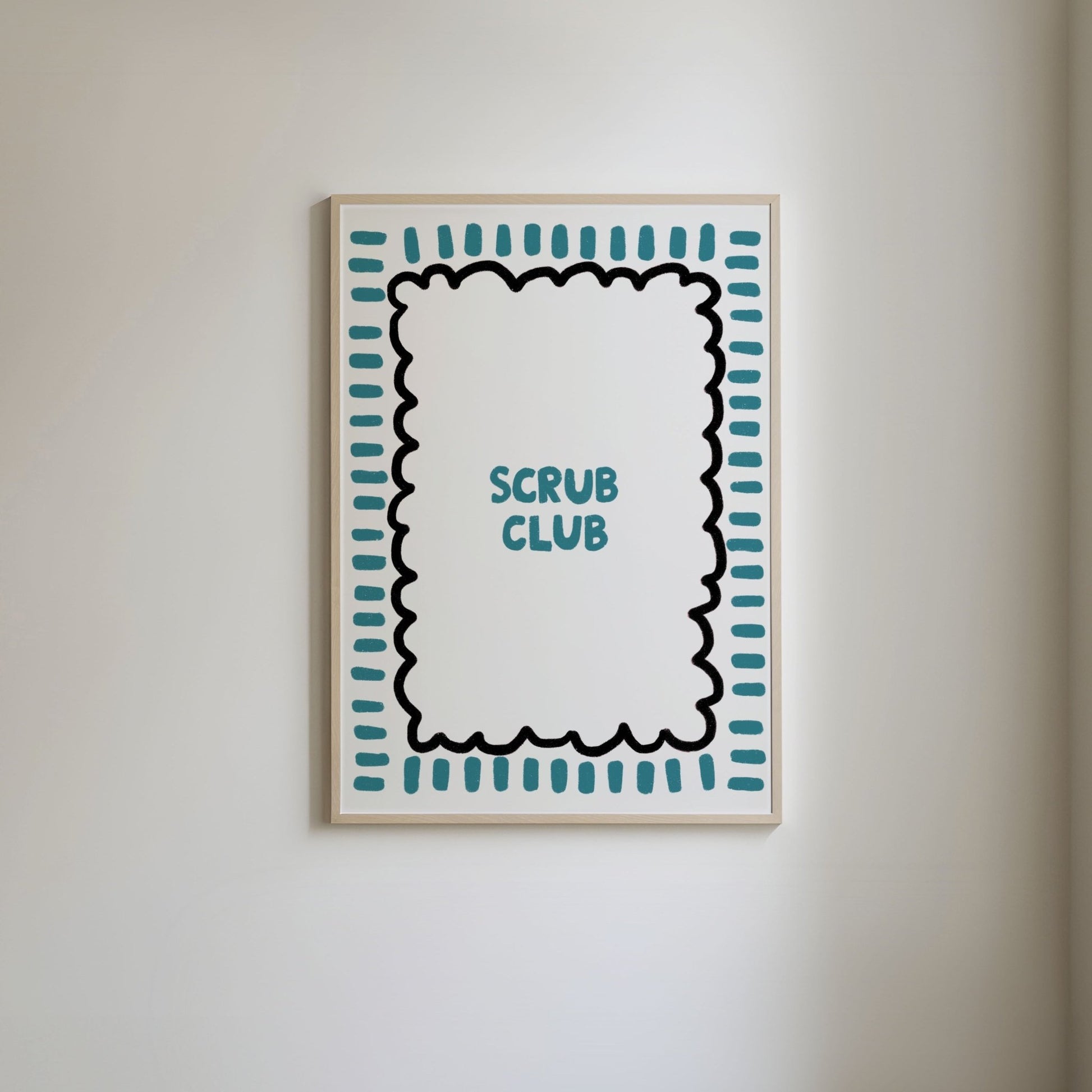 Join the 'Scrub Club' with this vibrant and colorful print! Featuring bold typography and a fresh design, this piece adds a fun, lively touch to any bathroom space. Available in three colorways—blue and black, green and pink, or red —this print brings a burst of energy and fun to your home