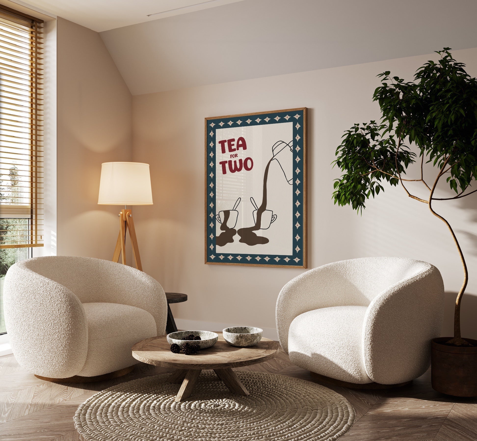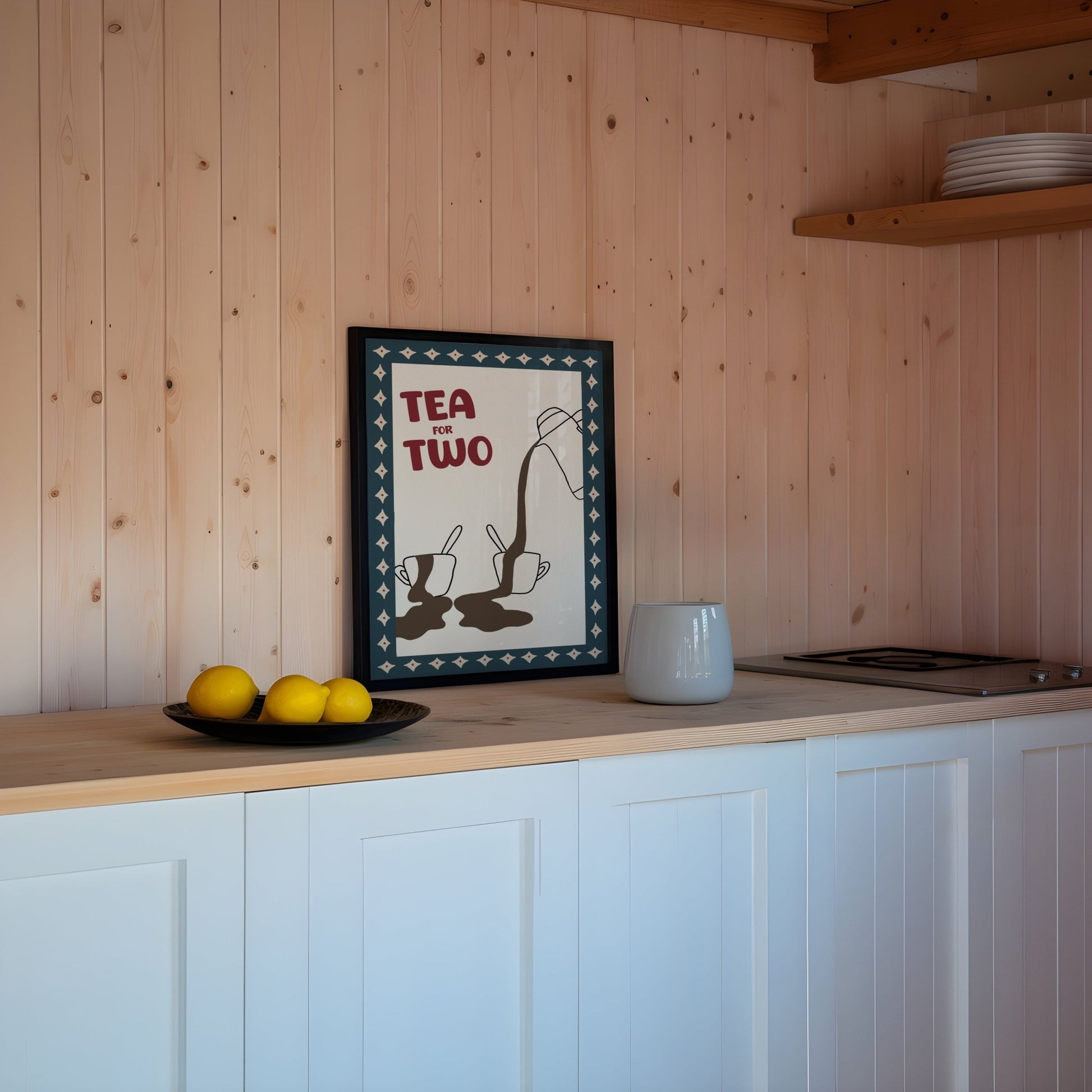 Create a cosy and inviting vibe with this ‘Tea for Two’ print, featuring an illustration of a teapot overfilling two teacups. The modern blue and red tones make it the perfect addition to your kitchen wall decor, dining room prints, or home office space. Ideal for anyone who loves relatable, fun home decor or enjoys sharing a peaceful tea break with a friend or loved one. Add a touch of warmth and personality to your home with this playful yet sophisticated design, perfect for tea lovers everywhere.