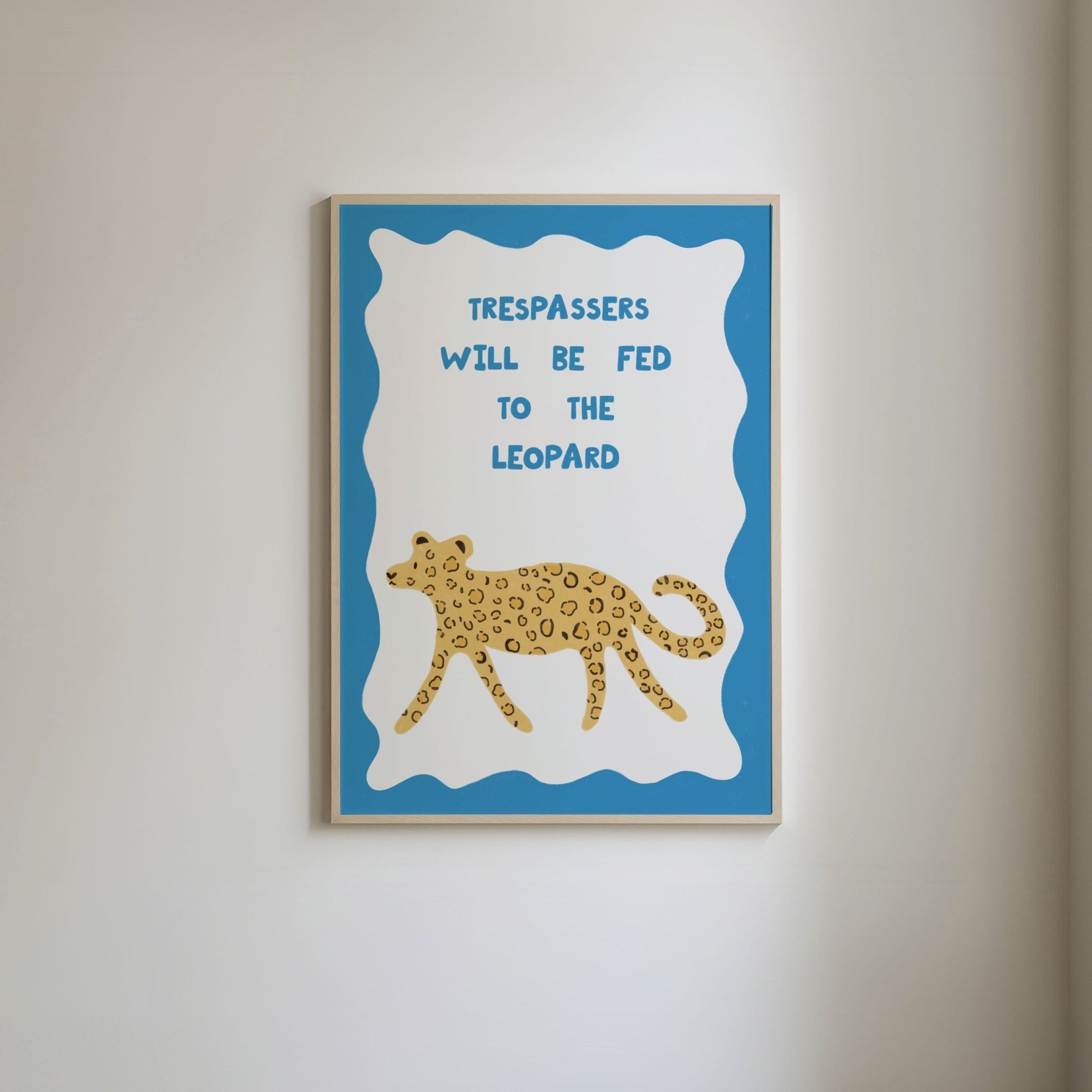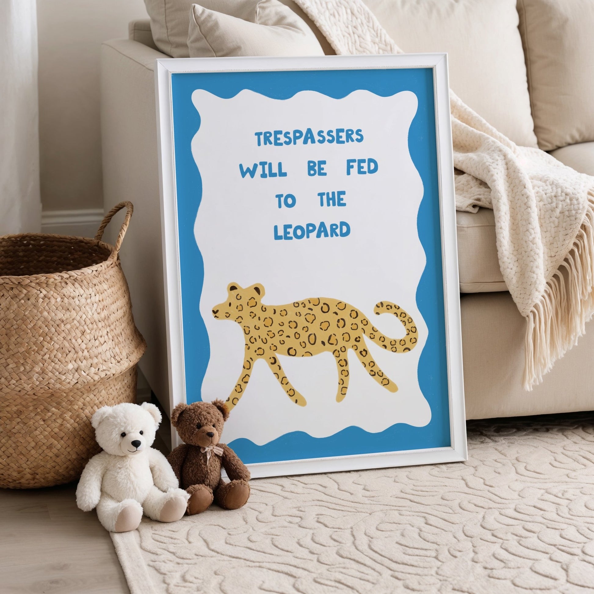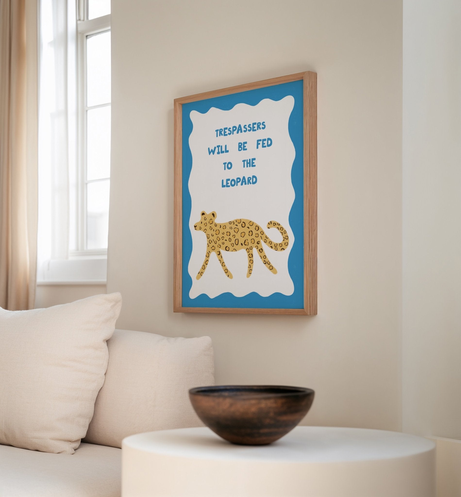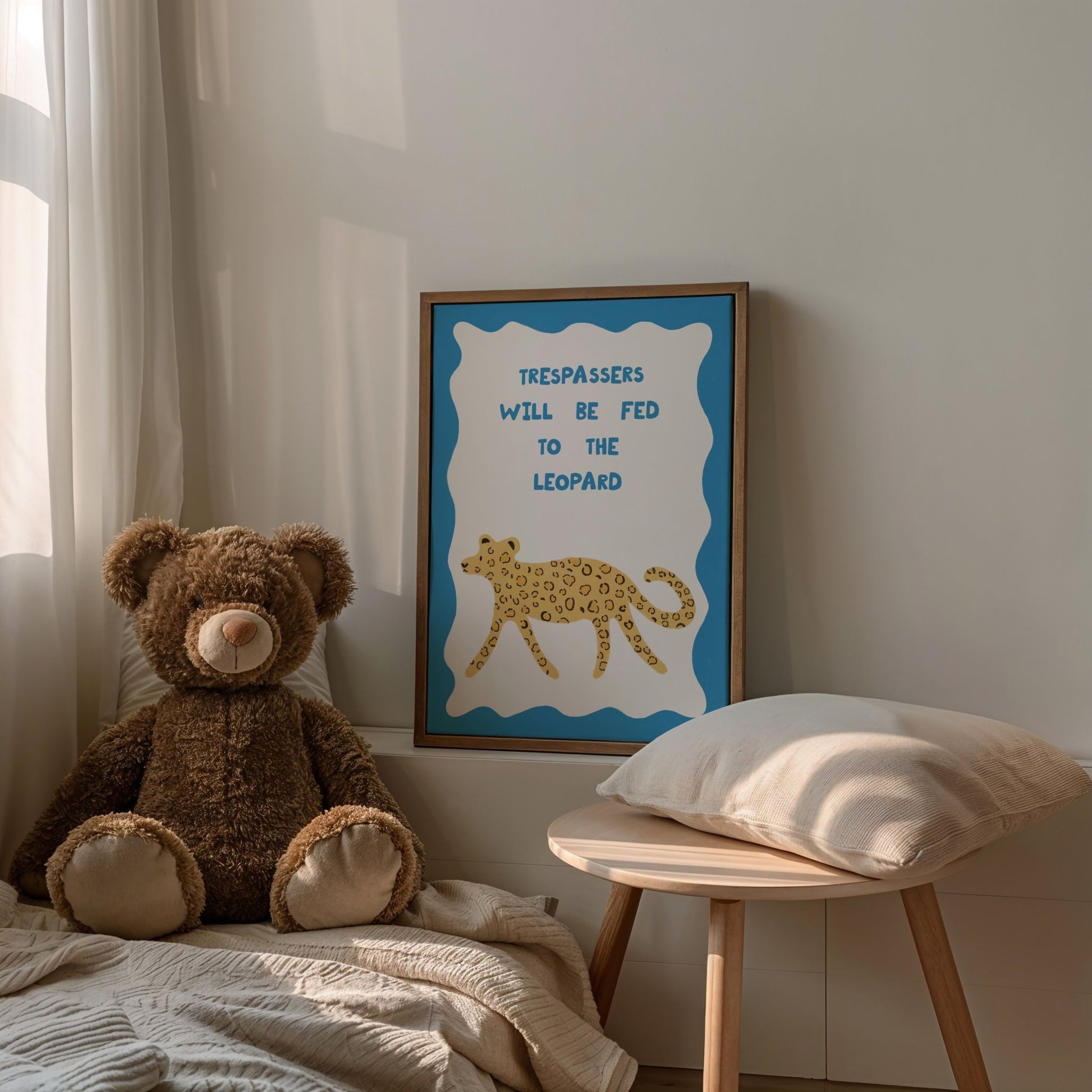 Make a bold statement with this vibrant print featuring blue text, a playful hand-drawn leopard, and a cheeky warning that’s sure to turn heads. The bold colours and edgy humour add a fun, unexpected twist to any space, whether in your living room, hallway, or kids bedroom. Perfect for those who love unique, personality-packed decor that stands out, this print brings a quirky charm to your walls and gives your space an attitude that’s anything but ordinary. Why settle for plain when you can add some wild fun?